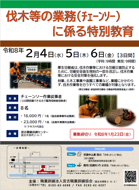 伐木等の業務(チェーンソー)に係る特別教育実施のお知らせ / 新着情報, 在職者訓練 / By web-miyako 【日時】令和8年2月4日(水)・5日(木)・6日(金) 9:00~16:00【場所】宮古職業訓練センター【対象】チェーンソー作業従事者 3日間受講できる方で雇用保険被保険者【定員】8名【費用】協会員事業所従業員 18,000円/名 会員外事業所従業員 23,000円/名【申込締切】令和8年1月23日(金)※受講申込書はこちらから→【PDF】・【Word】【お問合せ・お申込み】 宮古職業訓練協会(宮古市長町2-6-1) 📞0193-63-6688