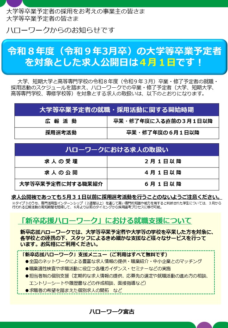 令和8年度(令和9年3月卒)の大学等卒業予定者を対象とした求人公開日は4月1日です。